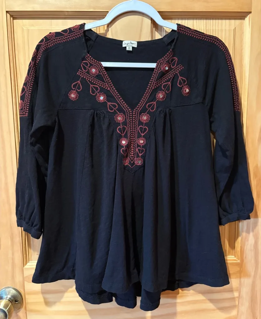 This Chip & Pepper long-sleeve, V-neck top with red embroidery detail features reddish-pink embroidery in a heart and floral pattern around the V-neckline and along the shoulders/sleeves. It has a relaxed, flowy, and gathered fit below the bust line, typical of a peasant or tunic top. The sleeves are three-quarter length with banded cuffs. Stylish and versatile.