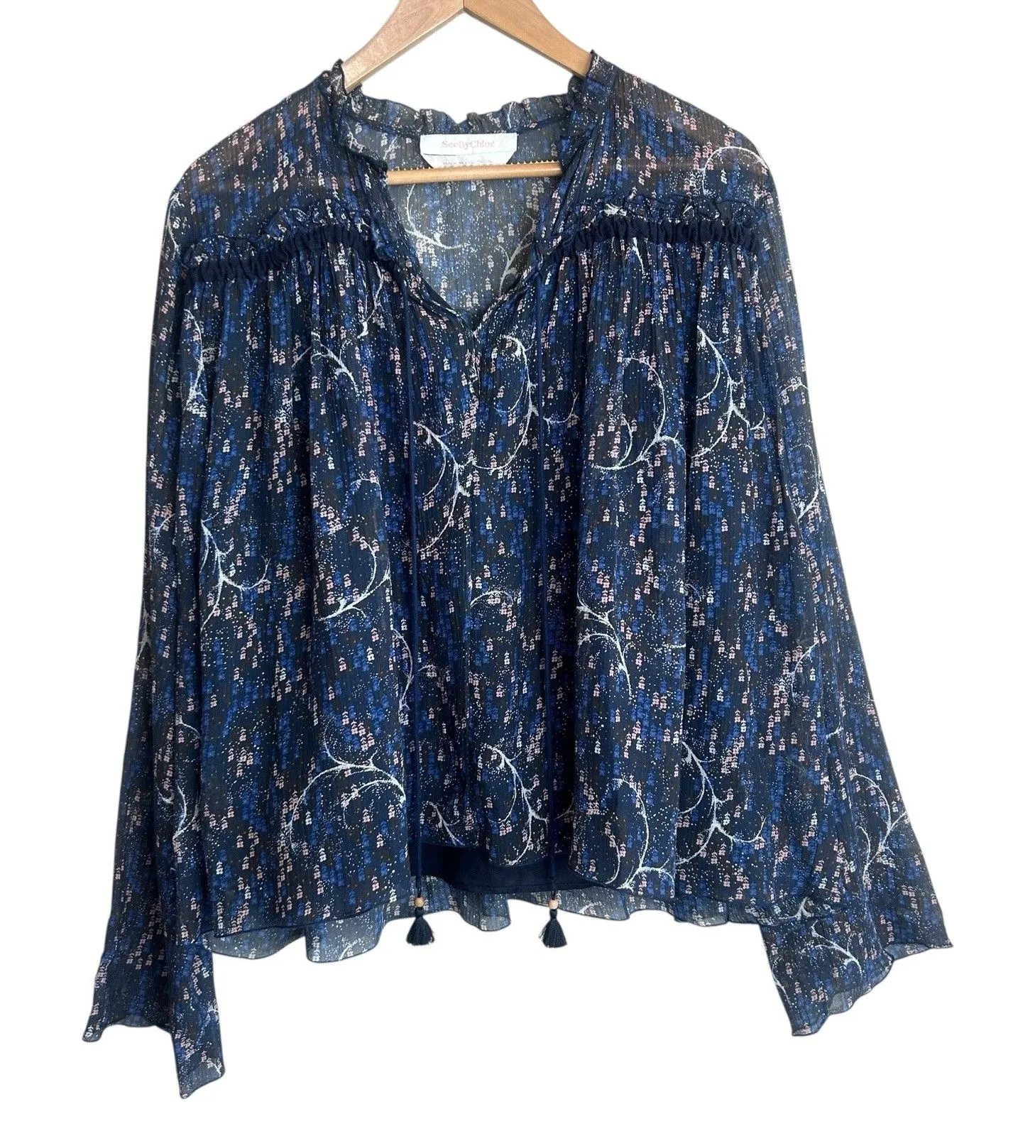 The Chloé Silk Boho Peasant Blouse Top in navy blue with a floral print is a stylish and chic addition to any woman's wardrobe. Made from luxurious silk, this blouse exudes a bohemian, peasant-inspired vibe with long sleeves and a basic style that is perfect for various occasions such as travel, parties, or casual outings. The designer brand and intricate floral pattern add a touch of sophistication to this versatile top, making it a must-have piece for those who appreciate unique and trendy fashion. Excellent condition