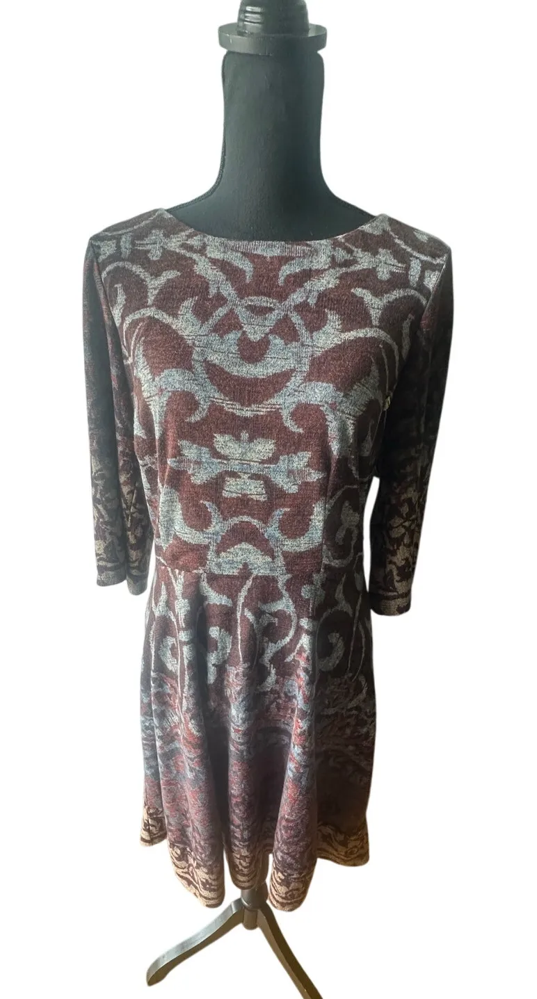 Elegant Chris McLaughlin fit and flare dress featuring a stunning gray and burgundy baroque pattern.... Show more