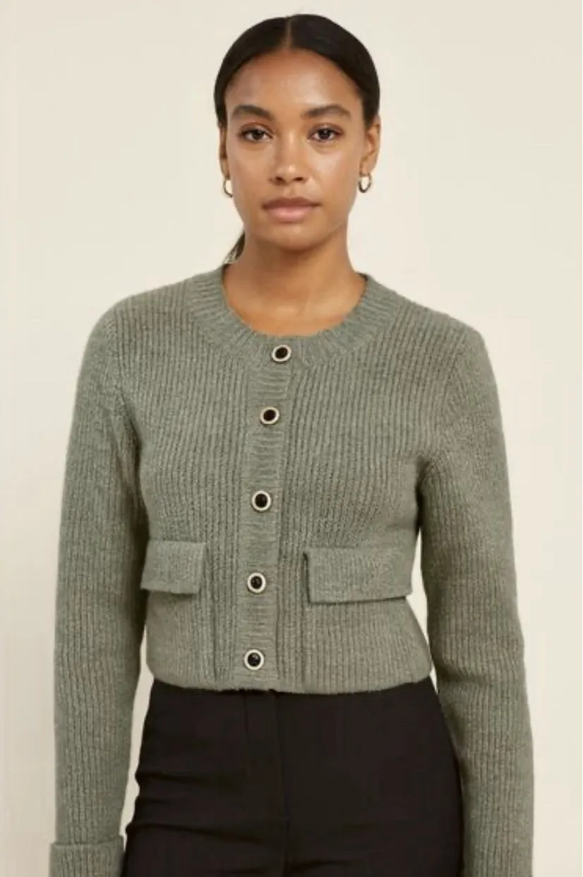 Measurements: Pit to pit 18 Length 22 Christian Lacroix Green Chunky Ribbed Cardigan Elevate your wardrobe with this chic and cozy cropped cardigan from Christian Lacroix. Perfect for a timeless, designer look with a modern fit. • Designer: Christian Lacroix (CXL) • Size: Women's Medium (M) • Style: Cropped length, crew neck, chunky ribbed knit texture, long sleeves with folded/cuffed hem, and two small decorative front patch pockets. • Color: Sage Green / Olive Green / Heather Green • Details: Features stunning gold-tone buttons with black centers on the front closure, adding a touch of luxe, designer flair. • Fabric Composition (from tag): 59% Polyester, 38% Nylon, 3% Wool. This blend provides warmth, softness, and durability. • Condition: Excellent pre-owned condition Chic, Classic, Parisian, Designer, Luxe, Prep, Preppy, Retro, Vintage Style, Chanel Style, Chunky Knit, Rib Knit, Wool Blend, Soft, Cozy, Fuzzy, Knit, Crew Neck, Round Neck, Gold Buttons, Decorative Buttons, Patch Pockets, Cuffed Sleeves