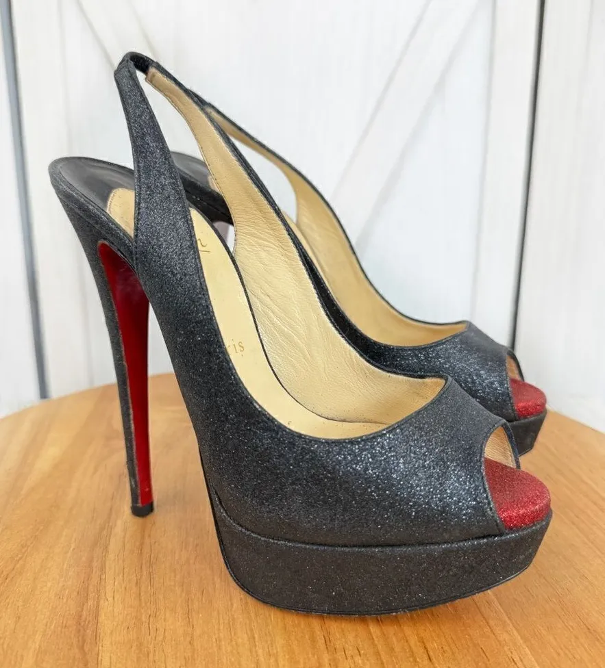 Christian Louboutin Lady Peep Glitter Platform Slingback Pumps Black Red Size 37.5 (7.5 US) Blac... Show more