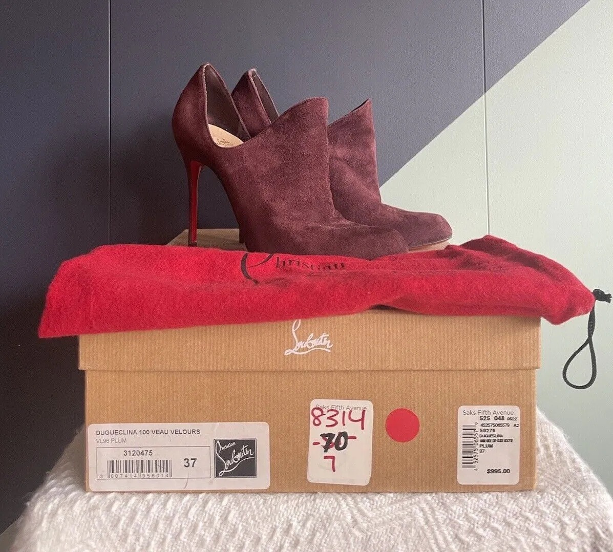 Christian Louboutin Duegueclina 100 Veau Velours (suede) Booties in Plum, a beautiful wine/burgundy... Show more