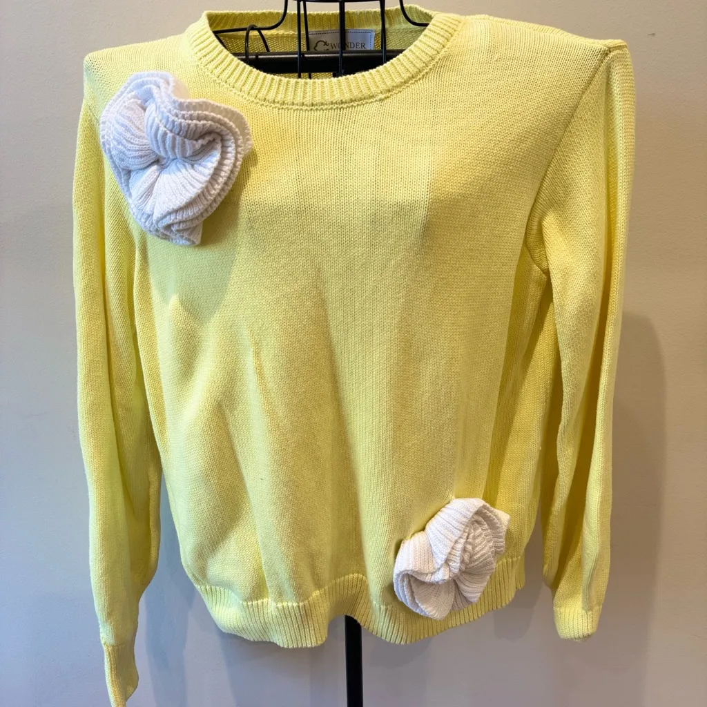 The Christian Siriano C Wonder Yellow Knit Sweater is a stylish and vibrant addition to any wardrobe. Made from cozy cotton knit, this long sleeve sweater features a crew neck and a beautiful design of white flowers for a whimsical touch. Perfect for travel, casual outings, or workwear, this size Large sweater offers a regular fit and is machine washable for easy care. The pullover style and cheerful yellow color make it a versatile piece for the winter, fall, and spring seasons. 100% cotton