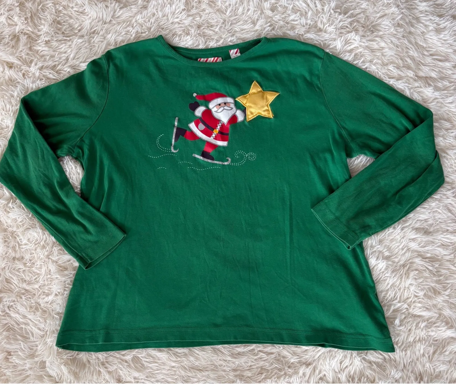 Unleash holiday cheer with this festive green long-sleeve top! The whimsical embroidered design featuring Santa ice skating alongside a bright gold star adds a playful touch. Perfect for spreading joy, this top offers both comfort and style with its classic crew neckline and relaxed fit. Imagine the laughter and smiles as you wear this to a cozy Christmas movie night, a festive holiday brunch, or even while decorating the tree with loved ones. Measurements: • Length: 26 inches • Width: 22 inches B Christmas Color: Green Type: T-Shirt Department: Women Style: Basic Material: Cotton Neckline: Crew Neck Sleeve Length: Long Sleeve Sleeve Type: Classic/Fitted Sleeve Accents: Embroidered Pattern: Solid Features: Embroidered Santa, Christmas Theme, Holiday Top, Festive, Comfort Fit Character: Santa Claus Fit: Relaxed Keywords: Christmas top, holiday shirt, long sleeve top, Santa Claus, ice skating, festive, green, Christmas shirt, holiday season, Christmas, plus size, XL, holiday top, women's top, embroidered