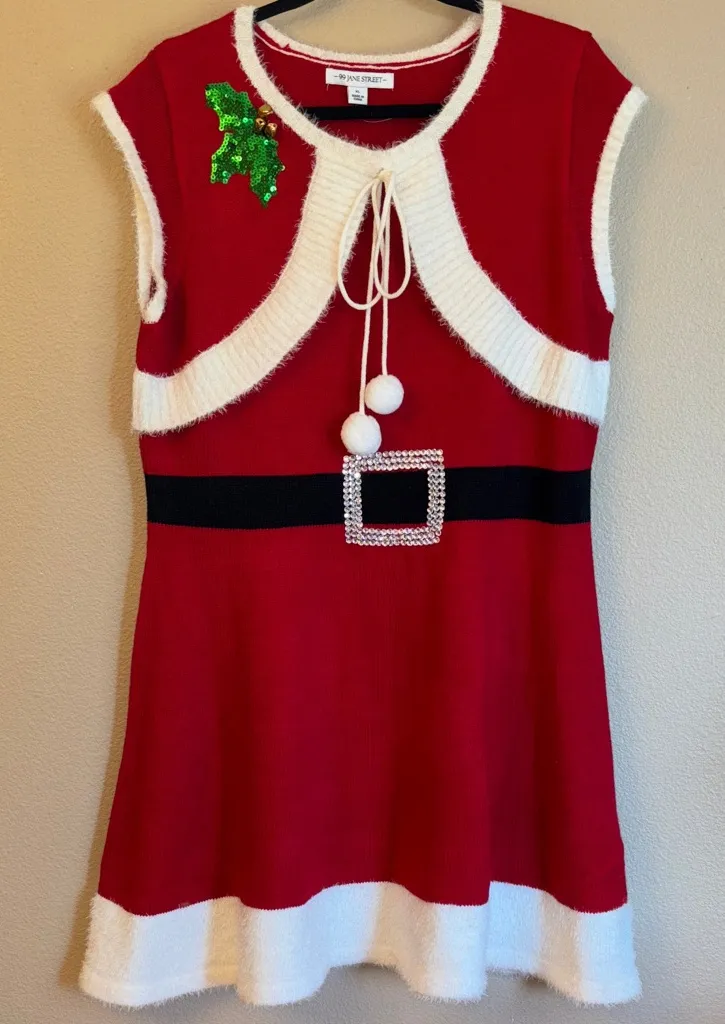 Christmas Santa Mrs. Claus Red Sweater Dress White Fuzzy Trim Size XL, measurements in photos. Super soft with lots of stretch! Sooo cute for all your holiday events, teachers, ugly sweater contests, or just making the kids or grandkids happy! Festive red dress with white fuzzy trim and jeweled Santa black belt design. Holly detail with green sequin and gold bells. Swingy flare skirt Fuzzy Pompom ties- one pompom is loose, hanging on by a thread and needs to be glued or sewn back on Small faint smudge on side of skirt, hardly noticeable and I think it’ll spot treat right out Overall great condition, worn once for kindergarten school event Non smoking