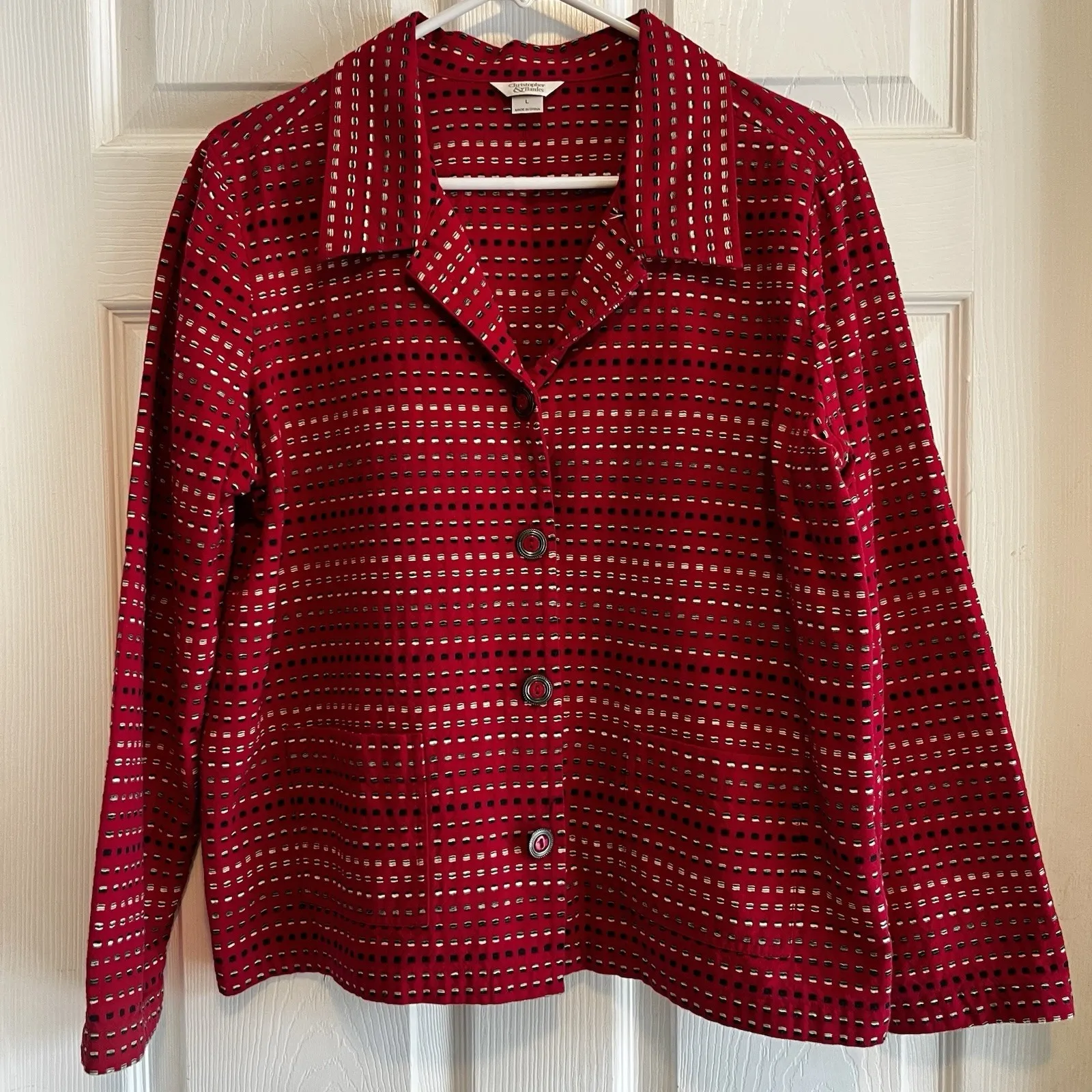 The Christopher & Banks Dark Red Woven Dobby Stripe Lightweight Button-Up Jacket in size L is a styl... Show more
