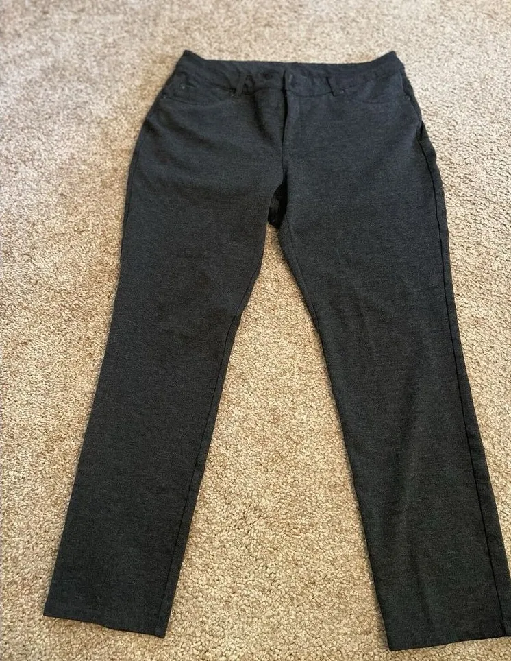 Sophisticated straight-leg dress pants in a versatile charcoal gray. Features clean lines, flat front design, and back pockets for a polished look. Perfect for office wear, business meetings, or formal occasions. The stretchy fabric blend ensures comfort throughout the day while maintaining a professional silhouette. In excellent condition with no visible wear or damage. CHRISTOPHER & BANKS SIGNATURE SLIMMING PETITE GREY PANTS SIZE 10P Approx measurements Inseam :27 inches Rise 10 inches Pre-owned in good condition Keywords: charcoal pants, work trousers, professional pants, straight leg pants, office wear, business casual, formal pants, gray slacks, career wear, dress pants