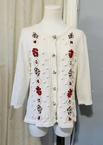 A charming white button-front cardigan from Christopher & Banks adorned with intricate floral embroidery. This knit sweater features a classic crew neckline and three-quarter length sleeves, perfect for layering. Delicate embroidered flowers in shades of red and brown are scattered across the front and back, interspersed with playful pom-pom accents and diamond cable knit details. The front closure is secured with matching fabric-covered buttons. Ideal for casual outings, garden parties, or a cozy evening indoors. Preowned - Good condition Measurements: • Chest: 18.5 in • Length: 23.5 in • Sleeve Length: 17 in Style: Cardigan Department: Women Material: 100% Cotton Neckline: Crew Neck Theme: Flower, Nature Sleeve Length: 3/4 Sleeve Type: Sweater Features: All Seasons, Stretch Pattern: Floral Fabric Type: Knit Accents: Button, Embroidered Knit Style: Cable-Knit Season: Spring, Summer, Fall, Winter Fit: Classic Keywords: Christopher & Banks, embroidered cardigan, floral sweater, button front, 3/4 sleeve, women's knitwear, cozy, garden party, spring fashion, lightweight knit, casual style, feminine details, pom pom accents