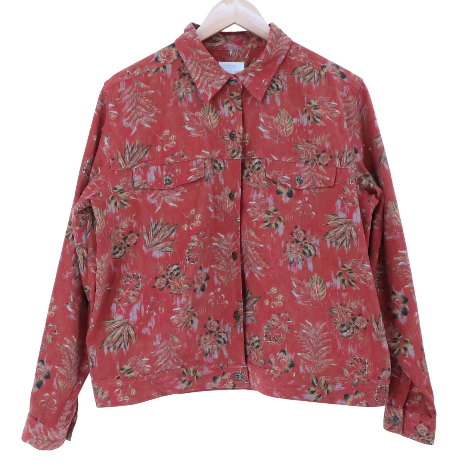 Soft lightweight shirt-jacket in a rich rust-red tone with an all-over botanical print. Relaxed fit with full button front, button cuffs, and chest pockets – a versatile layer for fall or spring. Vintage early '90s Christopher & Banks quality. Style Aesthetics: Cottage core · Boho · Rustic Vintage · Casual Outdoorsy · Layering · Retro Botanical Features: Rust Red Floral Print – Button Front – Chest Pockets – Button Cuffs – Relaxed Fit – Made in Hong Kong Condition: Excellent pre-owned condition. Materials tag was cut out. Measurements included – please review measurements prior to purchase to ensure fit. Measurements: • Pit to Pit: 22.5" • Length: 23" • Sleeve: 23.5" Please note: Color may vary slightly due to lighting and screen differences. Offers welcome!