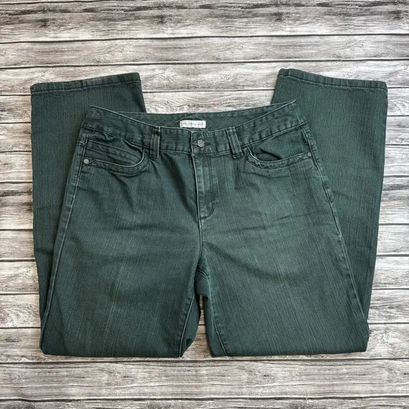 Christopher & Banks Women's Straight Leg Jeans Beltloops Thick Heavyweight Textured Denim Button & Zip Zipper Closure Straight Leg Traditional 5 Pocket Styling Rear Lace Detail Pockets Color: Dark Green Denim Size: 14 Great Pre-Loved Condition: no rips, pulls, tears, holes or stains, but there is some light wear to the bottom hems (see photos) Comes from a smoke free home 73% Cotton 26% Polyester 1% Spandex Measurements in pics- let me know if you need more True colors may vary due to lighting or monitor/screen settings Offers welcome, no trades Same or next day shipping excluding Holidays