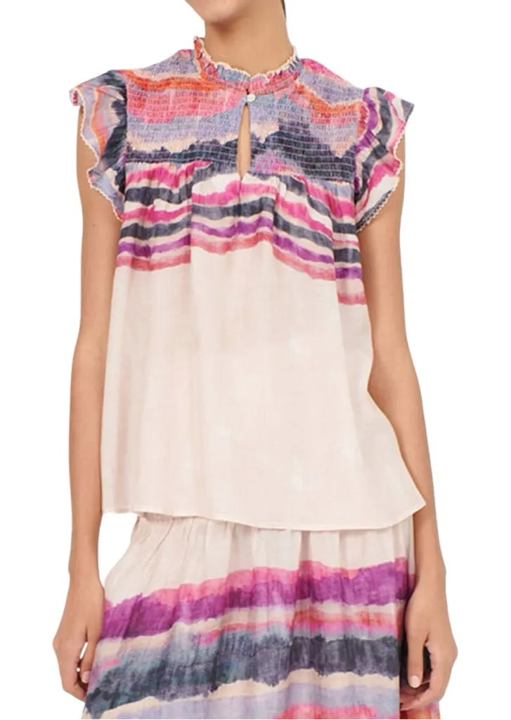 The Juni Top, adorned with a charming pattern of navy blue, pink and purple abstract stripes, with an ivory bottom, this silky blouse features a flutter sleeve with smocked elastic panel details, slips on with a button keyhole at higher ruffled neckline. 60% Cupro, 40% Viscose. Made in India Fabric: Lightweight non-stretch weave. No flaws, new with tags.