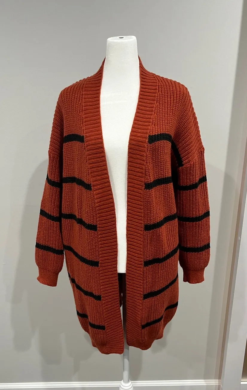Orange and black striped knit cardigan sweater. Open front design with long sleeves and a relaxed fi... Show more