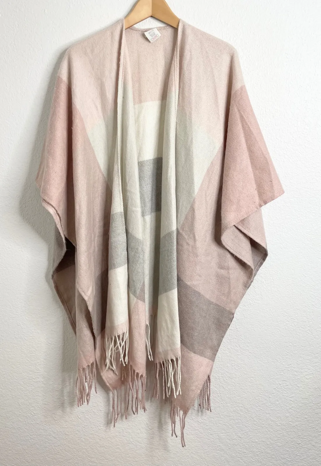 A cozy plaid poncho wrap featuring a timeless pattern in soft shades of pink cream and gray. This versatile piece drapes beautifully and is finished with playful fringe along the edges. Perfect for adding warmth and style to your everyday outfits or for a relaxed weekend getaway. One Size Keywords: plaid, poncho, wrap, scarf, oversized, fringe, pink, cream, gray, cozy, warm, winter, fall, boho, casual