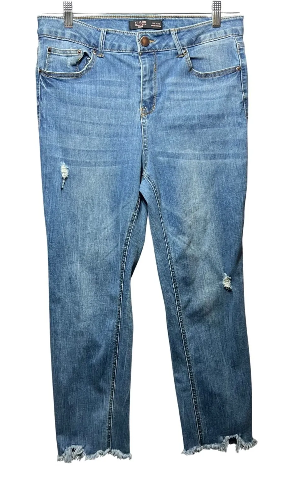 Keywords: Ci Sono jeans, distressed jeans, frayed hem jeans, medium wash jeans, denim jeans, straight leg jeans, casual jeans, women's jeans, size 15/32 jeans, ripped jeans, stylish jeans, comfortable jeans, everyday jeans
