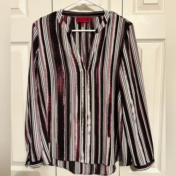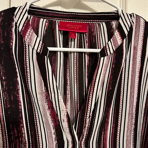 Jennifer Lopez purple, white and black striped v-neck blouse with high low hem line and buttoned sle... Show more