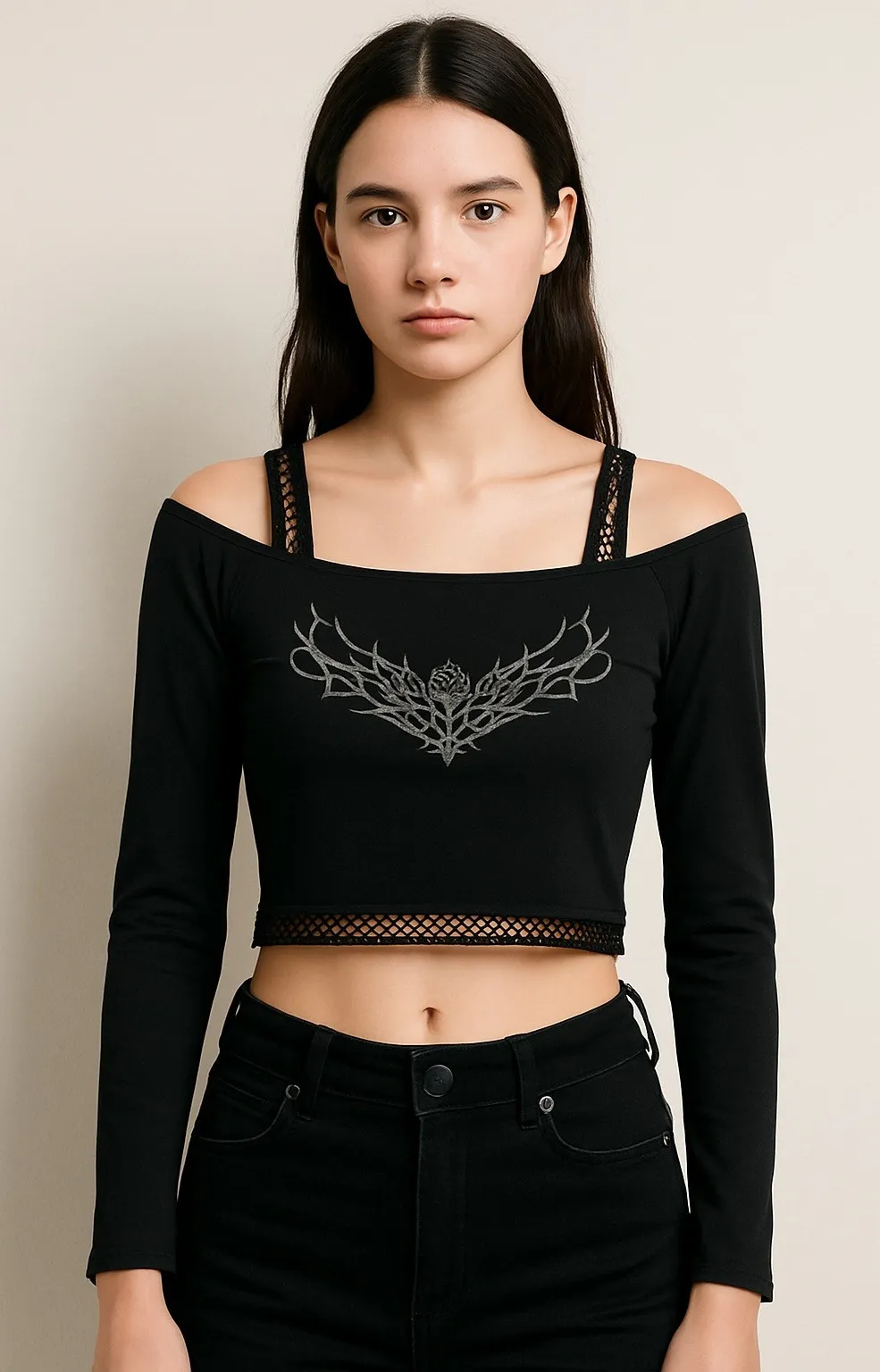 Black long-sleeve top with cold shoulder cutouts and delicate mesh straps. Features a silver rose gr... Show more