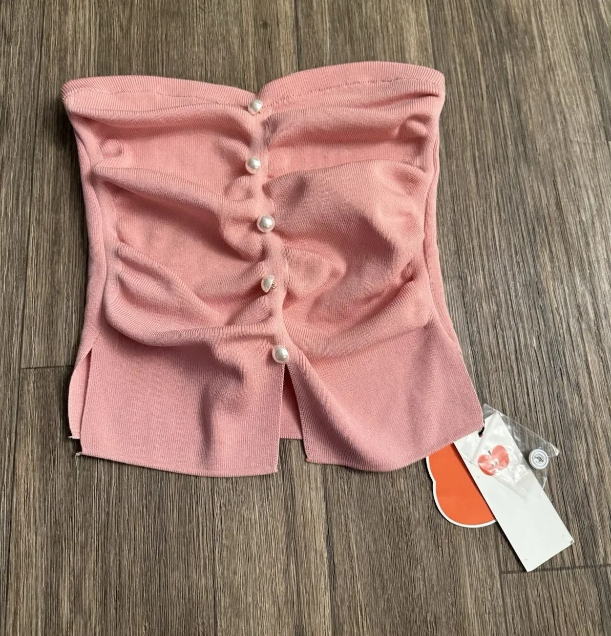 The product is a crop top tube top in a bubblegum pink color with faux pearls, brand labeled as Cider. This top is designed for women in size M with a cropped style, perfect for a trendy and casual look. Made with a regular size fit, this tank top is a fashionable choice for those looking to add a fun and vibrant touch to their wardrobe. NWT Measurements available upon request