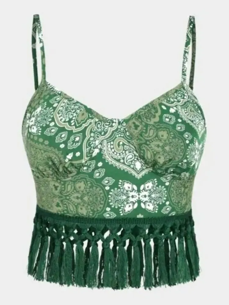 This small, green, V-neck Aztec tassel crop top is brand new with tags. Ideal for women with a love for the bohemian and hippie style, perfect for Cider enthusiasts. Features: • V-Neckline • Adjustable Spaghetti Straps • Tassel Fringe Hemline • Cropped Length • Pullover Styling • spring, fall, summer • Aztec Print • hand wash • Polyester Measurements: armpit to armpit 15.5 in length 16 in Condition: New With Tags All offers welcomed! ❤️ Professional seller, smoke free home and same or next day shipping. Like items for price drops. Receive the 30% off bundle discount when you purchase two or more items. aztec, colorful, fringe, tassel, lightweight, silky, cropped, crop, crop top, vacation, travel, cruise, layering, edgy, urban, streetwear, chic, city, clubbing, clubwear, college, chic, stylish, trendy, casual, classic, classy, night out, date night, party, Crop, Cropped, Size 4, Size 6, balletcore, ballet, dancer, dancecore, nwt, bnwt,