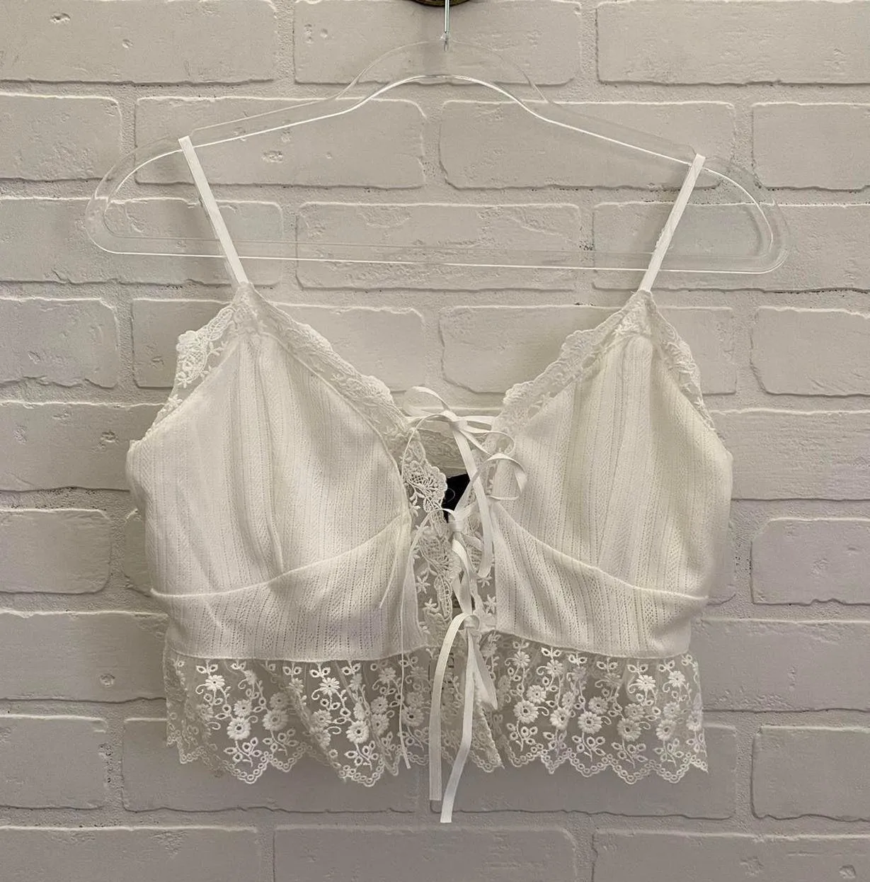 White lace edge cami crop top - has some stretch, adjustable straps, and adjustable front ties - new with tags Tagged size L Measurements laying flat: Please read before purchasing: I do my best to scour each item before listing, and do not accept returns unless there is a tragic flaw not noted -or- pictured.