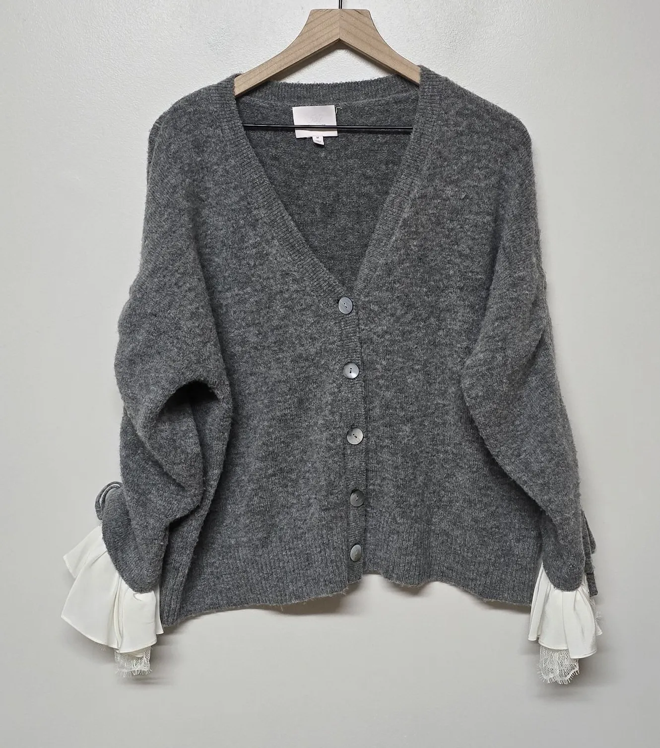 Overall in good condition - slight piling and one small faint spot around the wrist area. The Cinq À Sept Atlas Lace Cinch Sleeve Knit Cardigan in Heather Gray is a stylish and classic women's sweater. Made from a wool blend fabric, this cardigan features a V-neckline and long sleeves, perfect for a sophisticated and trendy look. The heather gray color adds a versatile touch to the designer piece, making it a timeless addition to any wardrobe.