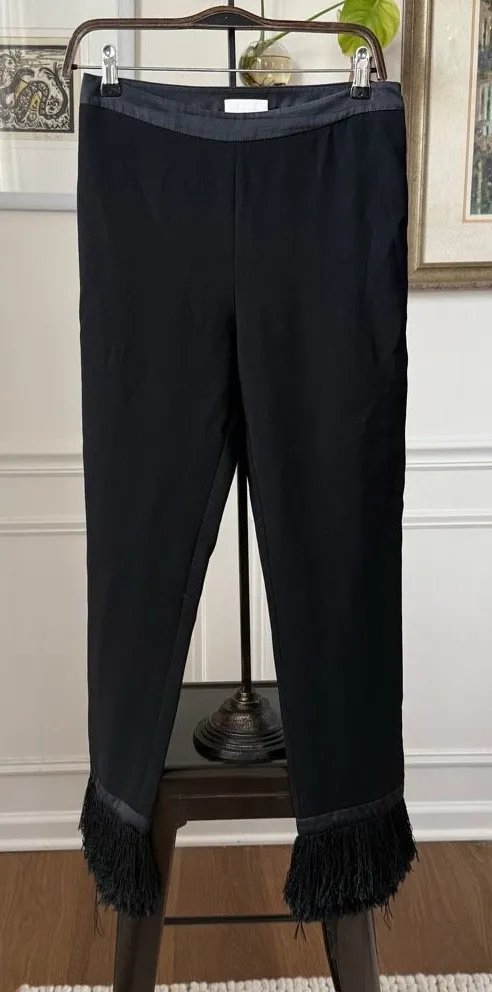 Cinq a Sept women’s black straight leg pants with silk tuxedo stripe and 3 inch fringe at the hem of each leg. Side zip. Laying flat measures 14.5 inches straight across the waist with a 10.5 inch rise and 29 inch inseam, including the fringe. $225 retail. The pants are triacetate and polyester blend and the tuxedo striping down the outside of each leg, at the waist and just at the above of the trim is 100% silk. Purchased from Neiman Marcus.