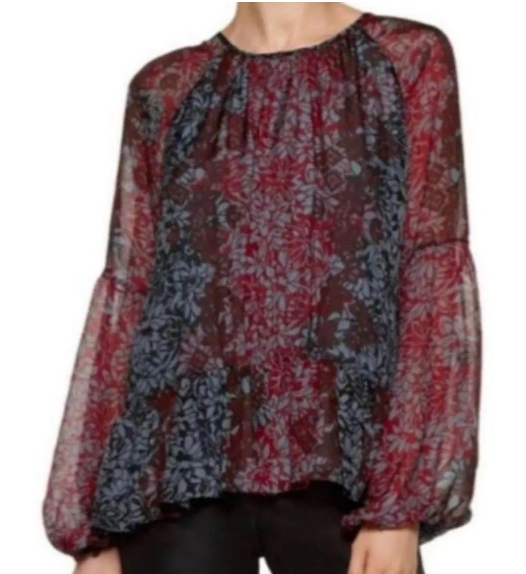 Size XS Excellent preowned condition - no flaws 18" pit to pit 25.5" length Flow with effortless grace in this captivating Cinq a Sept sheer blouse. The exquisite floral print, a mesmerizing blend of deep reds, grays, and subtle browns, dances across the luminous silk fabric, creating a captivating visual depth. Delicate ruffles cascade down the hemline, adding a touch of romantic movement and feminine charm that will turn heads. The sheer construction allows for beautiful layering, inviting you to play with textures and create your own signature look. Perfect for adding a touch of refined artistry to your ensemble, this blouse is ideal for a sophisticated evening out, a chic brunch with friends, or a stylish addition to your vacation wardrobe. Key words: designer luxury silk party special occasion
