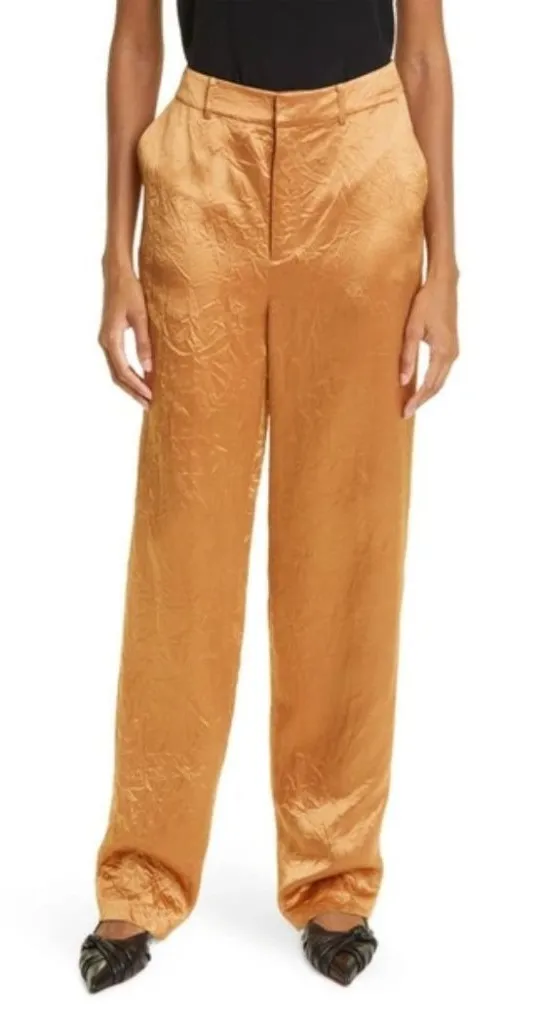 Cinq a Sept Kasid Satin Straight-Leg Pants Womens Size 6 Pecan Tan High Waist New without tags on, no flaws. "Kasid" pants crafted from crinkled satin fabric High-rise cut Flat front On-seam pockets; back welt pockets Straight legs Full length Hook fly closure Belt loops 100% Acetate