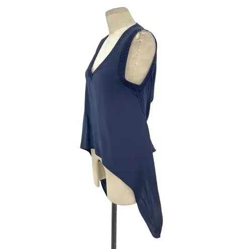 Cinq a Sept Olimpia Top in Navy Blue Sleeveless V-neckline with rib trim detailing Wide ribbed trim at neckline, sleeves and sides. Longer on sides; sides can be tied Long ruffle tie details hang down at sides Pullover 100% silk Trim: 63% viscose 37% nylon Size Small Armpit to armpit is approx 19" Length is approx 21"