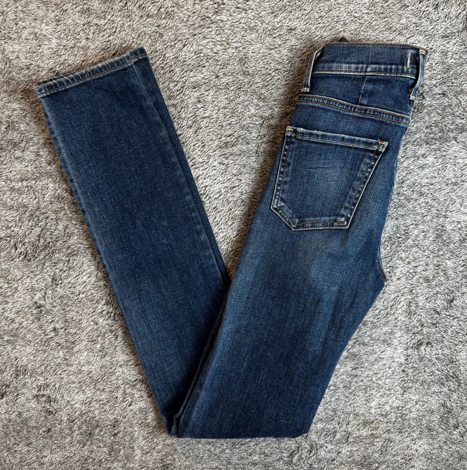 Gently worn, no known stains or flaws Size - 24 Inseam - 33 inches Color - Dark blue denim Retail -... Show more