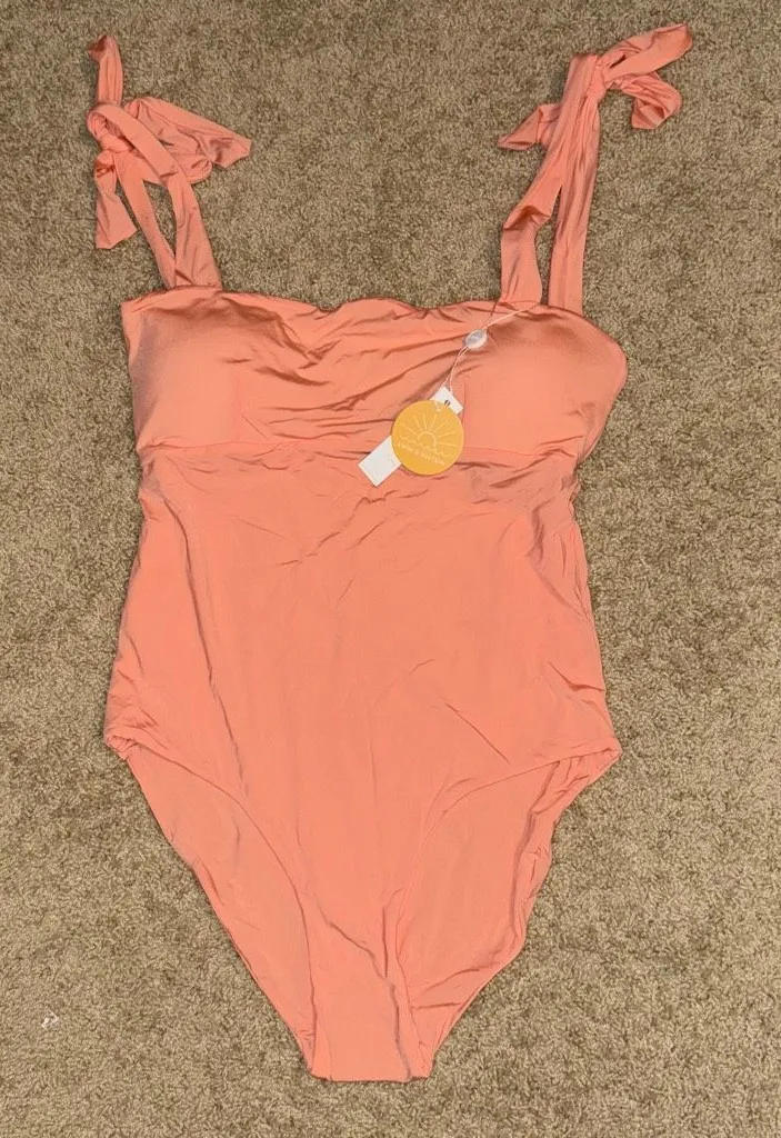 NWT with no flaws. $180 MSRP This style features a straight neckline with ruching detail, wide shoulder straps that tie at the top, and a full-coverage bottom. Adjustable shoulder ties and bra pads. Sanitary liner still intact. Stock photo for example only. Measurements are approximate. Slight color variations may be seen in pictures due to lighting and camera settings. please see measurements to determine fit. Non smoking dog friendly home