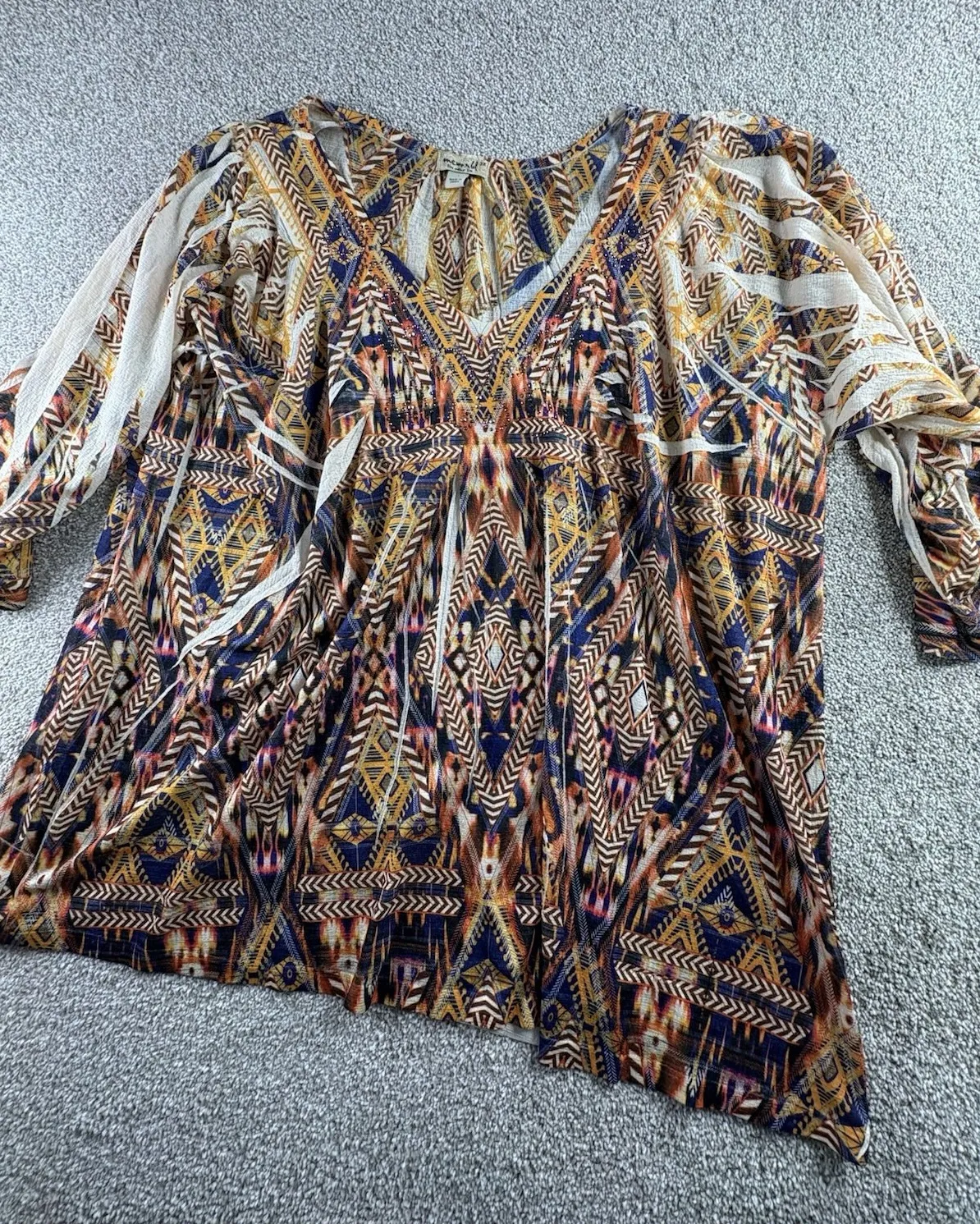 Beautiful Citron Santa Monica boho tunic top in women's size 3X. Features a stunning tribal / geometric print in rich navy, mustard, rust, and cream tones with rhinestone embellishments at the front for added sparkle. • Flattering V-neckline • Lightweight, stretchy fabric • Long sleeves • Flowy, relaxed tunic fit • Embellishments on front (see photos) • Perfect for boho, festival, casual, or layered looks Approximate Measurements (laid flat): • Bust (pit to pit): ~30" • Length (shoulder to hem): ~29" (Please compare to a favorite top for best fit) Smoke-free home. Fast shipping.