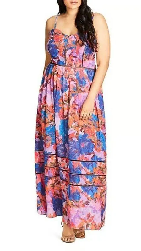 City Chic Size 20 / L Blue Purple Abstract Floral Print Stained Glass Maxi Dress Good, Pre-Owned Condition Size: Large, equivalent to a women's plus size 20 Brand: City Chic Color: Blue & Purple Sleeveless Maxi length Abstract floral print Sweetheart neck Sleeveless with adjustable spaghetti straps Smocked back Side zip closure Eyelet ladder lace details at the waist and hemline Some discoloration on the inside lining of the underarms as shown but not visible while worn 100% Polyester Measurements: Bust: 23 inches Waist: 21 inches Length: 57 inches