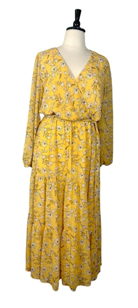 Style Details • Maxi belted dress • Blouson elastic waist • Removable fabric belt/sash • V-neck with wrap top • Pullover style • Long sleeves • Yellow, white & gray floral • 100% polyester • Polyester lining • Machine wash • Excellent preowned condition Fit Details • Size L/20 • 23” across underarms • 57” length from shoulder to hem • Measurements taken across laying flat Boho bohemian plus size curvy long casual spring summer flowy curvy colorful cottage vacation beach