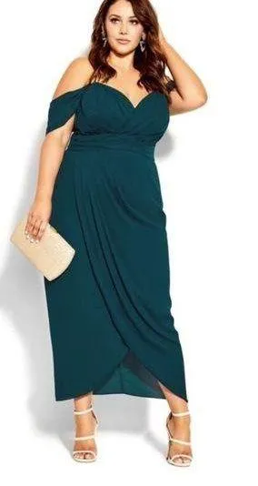 Dress is in new condition with no flaws. -Maxi Length -Off Shoulder V Neck -Thin Shoulder Straps -Built In Molded Cups -Tulip Drape Skirt -Invisible Back Zipper Closure -100% Polyester Party / Special Occasion / Formal / Prom / Date Night / Girls Night / Wedding Guest / Shower / Brunch / Bachelorette / Vacation / Holiday / Resort / Cruise / Sexy / Comfortable / Comfy