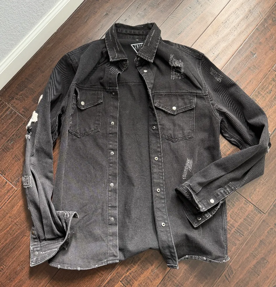 Worn once Long Distressed Denim Jacket, crafted distressed hemline, spread collar, front button-down design, Relaxed fitted look. Featuring a crafted 3D Fuzzy texture Patch design on the back . (WASH INSTRUCTIONS: COLD DELICATE/GENTLE WASH. HANG DRY ONLY. NOT TO DRY IN DRYER MACHINE AT ANY TIME.) 86% COTTON 8% RAYON 6% POLYESTER