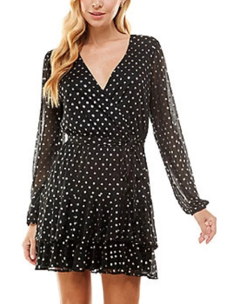 City Studio Polka Dot Foil Long sleeve Ruffle Dress Black Gold XS. V neck with elastic waist and tie... Show more