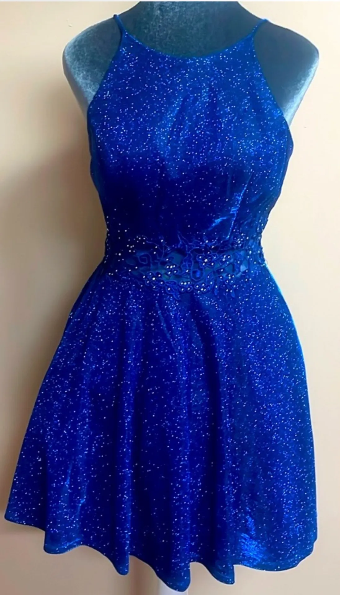 City Vibe 5 Royal Blue Glitter Floral Mesh Waist Homecoming Formal Mini Dress Size 5 Features: glitter rhinestones embossed throughout, halter neckline, floral mesh around waist, zip up back, mini 100% Polyester In perfect pre-owned condition Smoke free home •Offers welcome Style Tags: homecoming, prom, formal, spring, summer, mini, wedding guest, y2k, tulle, rhinestones, girly, fun, party, school dance, preppy
