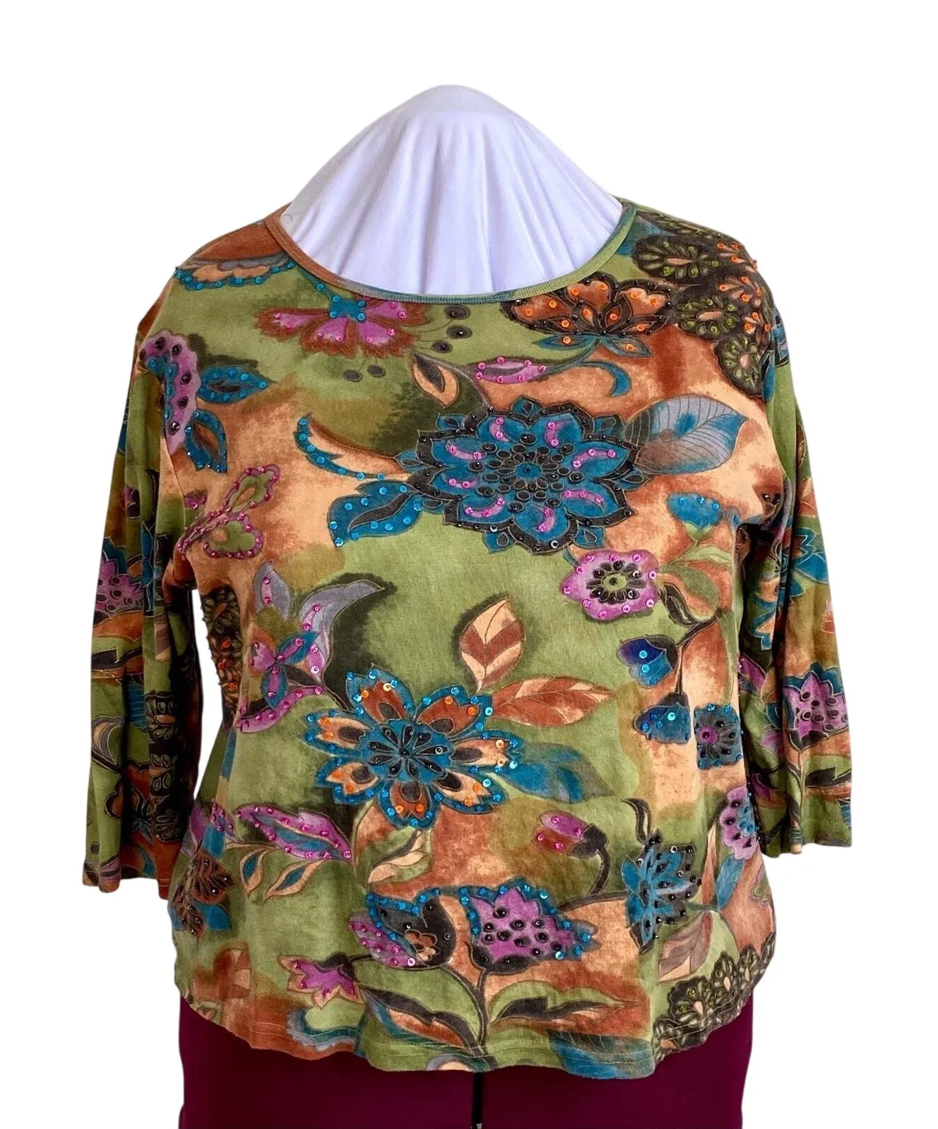 CJ Banks Beaded Sequins Blue Green Peach Print Top Blouse 1X. Crew neck style. 3/4 length sleeves. 9... Show more