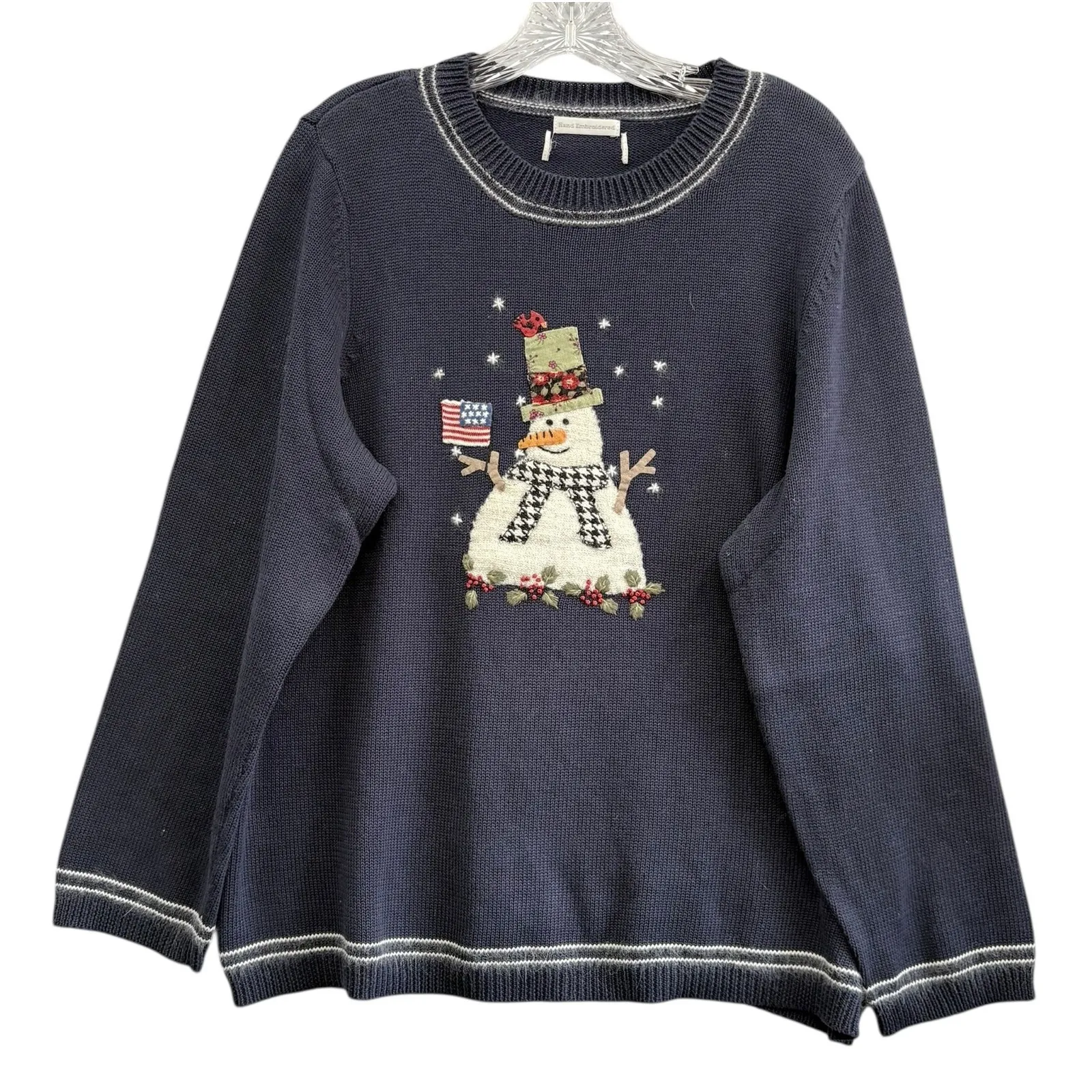 CJ Banks Women's Hand Embroidered Patriotic Snowman Holiday Knit Sweater Top Gently Used- No Size Tag Festive hand-embroidered sweater featuring a charming snowman design. This knitted top showcases a patriotic snowman holding an American flag, adorned with a floral hat and scarf. The sweater has a navy blue base with white striped detailing on the neckline, cuffs, and hem. A perfect blend of holiday cheer and Americana charm. Size Large- Based On Measurements: 27" Length 24" Pit To Pit 24" Sleeve Length Patriotic, Holiday, Whimsical, Novelty, Embroidered, Winter, Americana, Festive, Vintage-Inspired, Statement Feel Free To Ask Questions Or Request More Photos! SKU:0078