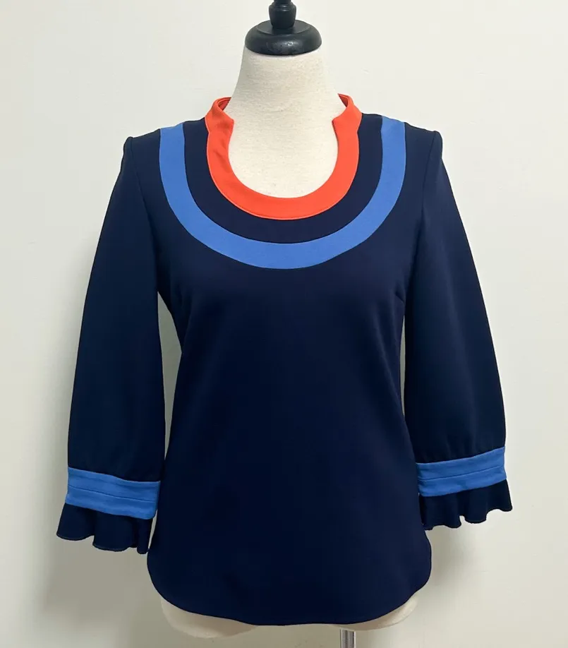 Brand: CK Bradley Size: Medium (**please see measurements below as this has a slim fit**) Style: Navy blue, blue and orange thick ponte knit top. U-neckline. 3/4 length sleeves with ruffle cuffs. Rounded bottom hem. Back zipper closure. Slim fit cut. Top itself weighs 1lb and 3oz. Dry clean garment care. Condition: Standard pre owned wear such as very minor pilling and chips on the zipper pull. No rips or stains. Approximate measurements when laid flat: 18.5” bust, 17” waist, 25.5” length from top of shoulder to bottom hem and 21” sleeve. Please feel free to reach out with any questions prior to purchase. Comes from a smoke free home. I typically ship within 24 hours but please be advised that I do not ship on Saturdays, Sundays or holidays. Thank you for understanding!