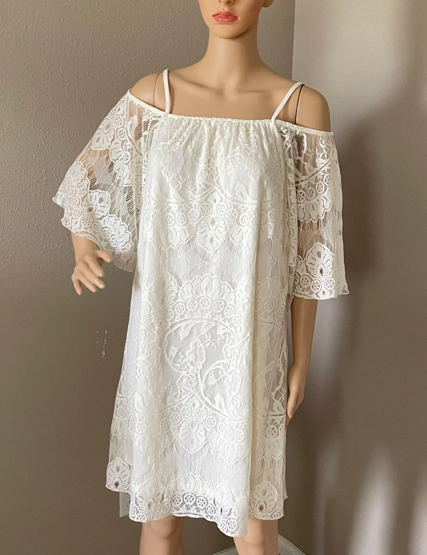 J Gee NWT Ivory Lace BoHo Off Shoulder Dress Small Beautiful dress with lace overlay with lace bell sleeves, polyester lining underneath. Dress is above the knees can be worn loose or with a belt. See pictures for measurements, smoke free home