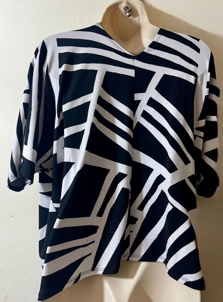 Clara Sun Woo chic abstract design with short sleeves. Comfortable and stylish for any event. Approximate measurements ptp 24”. Length 24”. PFSF home. All sales photographed. Rack