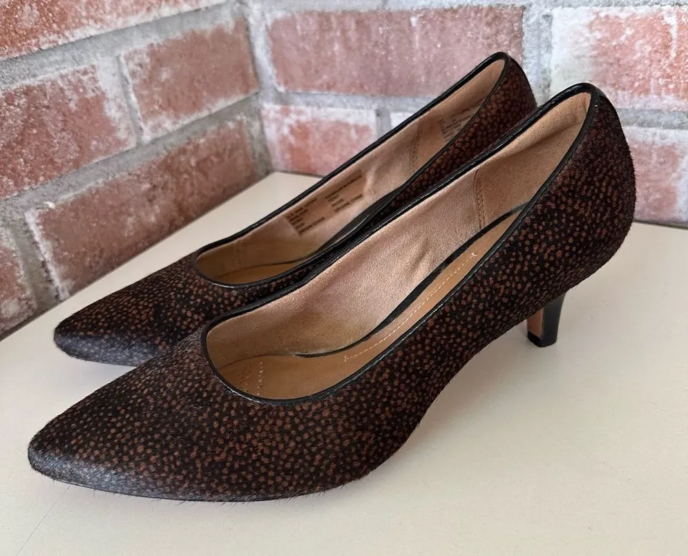Women’s size 7 Clarks Artisan Sage Cooper kitten heels. Real calf hair, brown with black spotted des... Show more