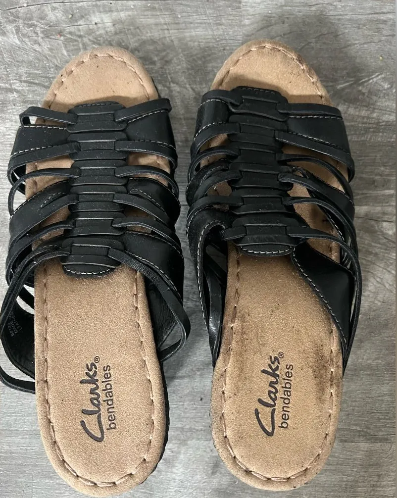 RARE 🔥🔥🔥 CLARKS BENDABLES STRAPPY WEDGE WOMEN'S SANDALS STYLE #60123 Size 6.5 COLOR BLACK/BROWN... Show more