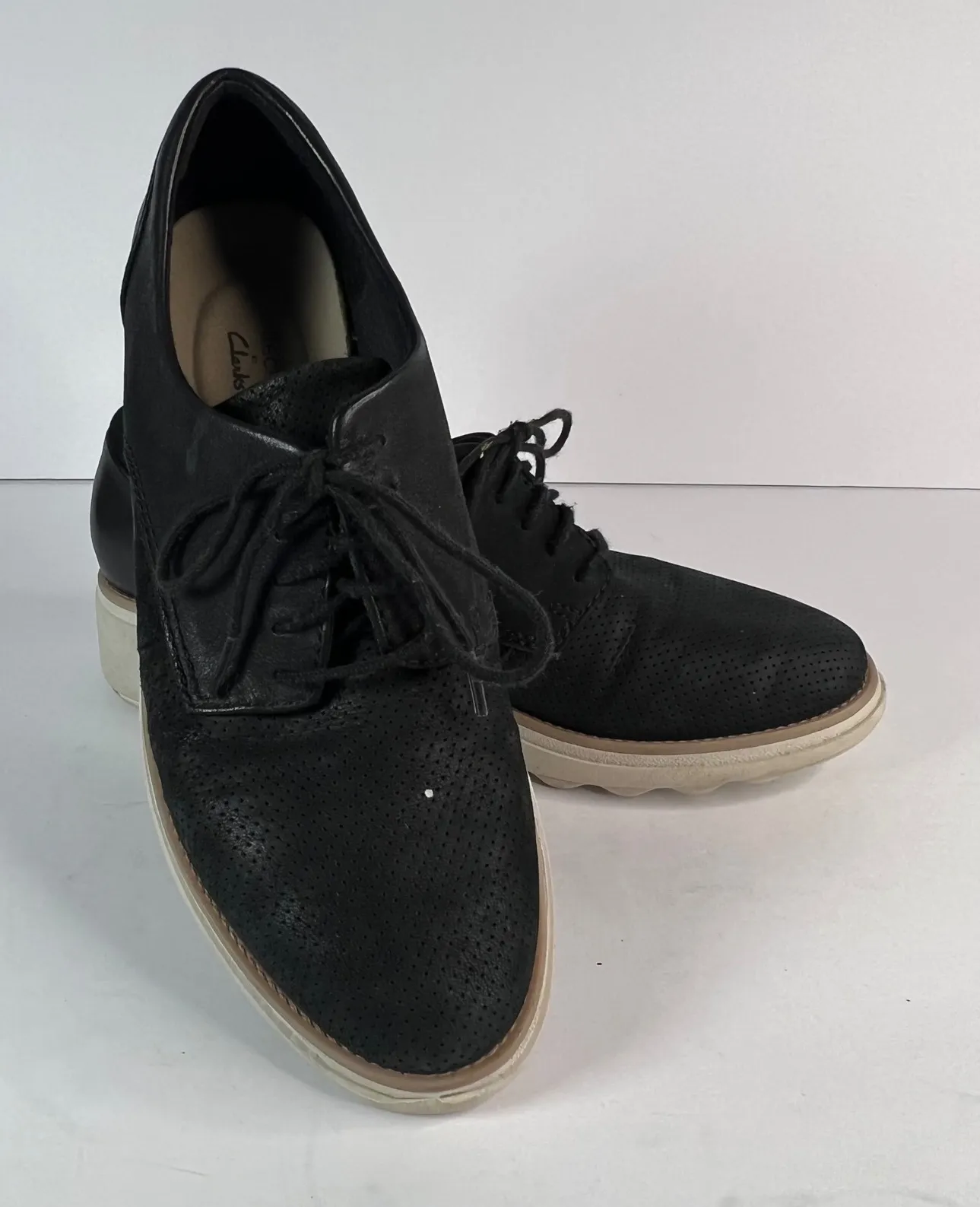 Clarks Collection black perforated oxford platform wedge shoes. These stylish shoes feature a classi... Show more