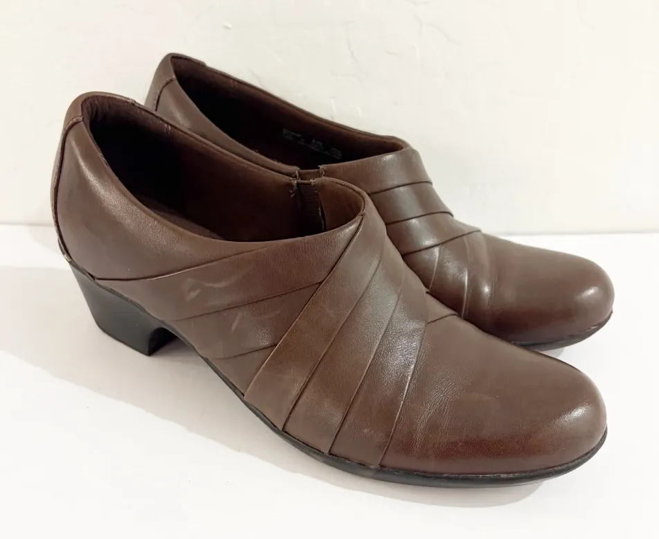 Clarks Collection Channing Essa Brown Leather Slip On Heel Loafer Size 8.5M Brown leather upper Sli... Show more