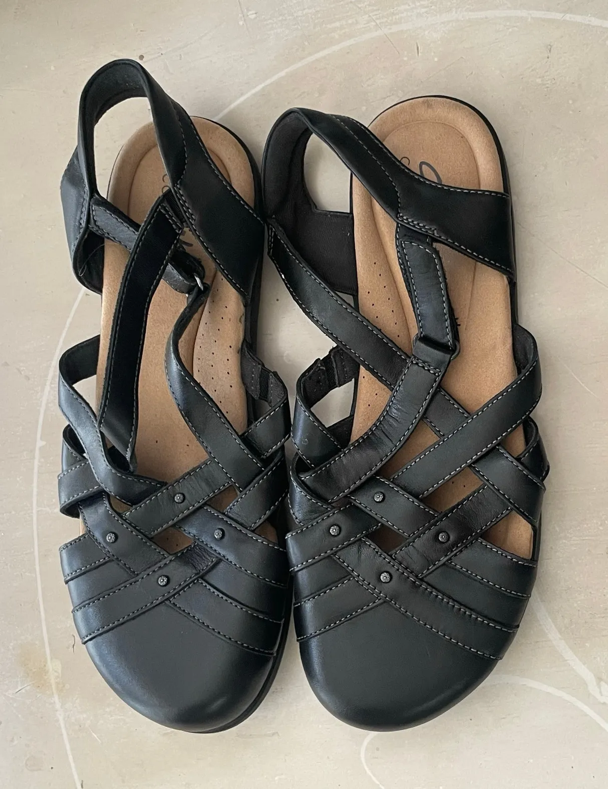 Strappy sandal with studded detailing and round toe with adjustable strap in the back size 8.5 in th... Show more
