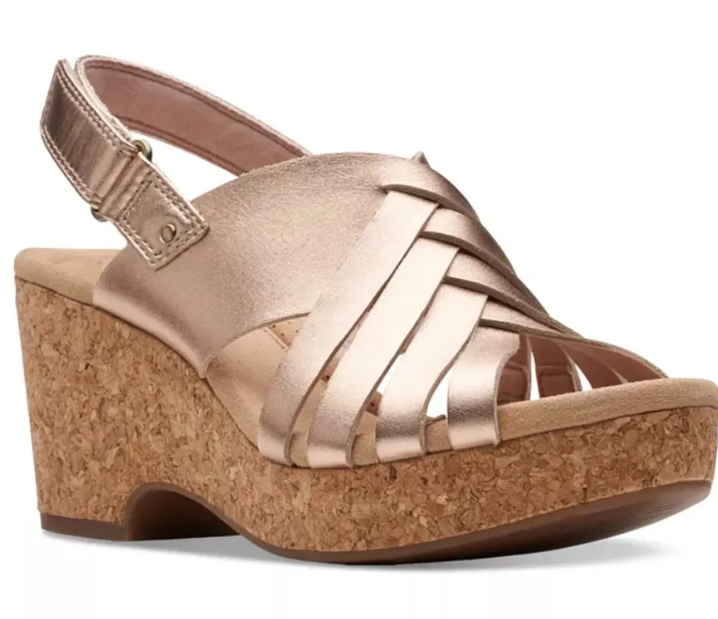 Clarks Size 7 Women's US Gorgeous and comfortable sandals in rose gold Cork wedge; strap goes around... Show more