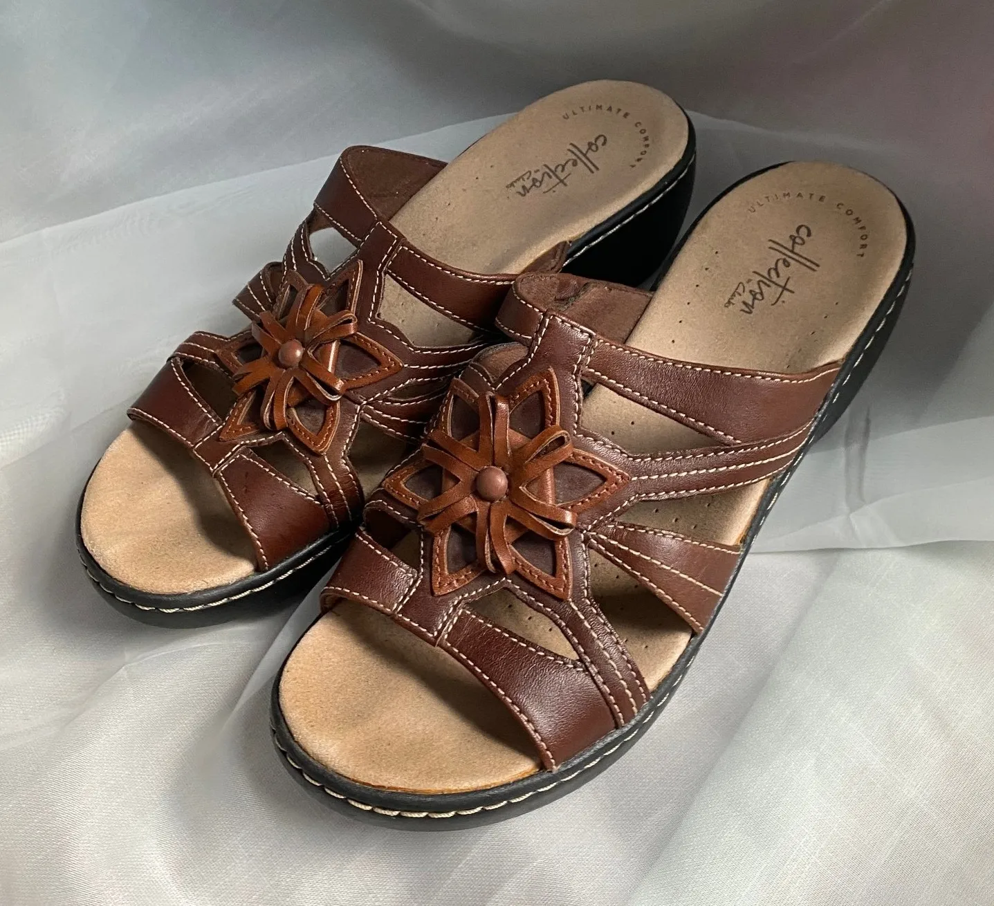 vintage, 1970's, 1990's, cutout, peep toe, open toe, western, summer, vacation, Clarks, brown sandals, leather sandals, wedge sandals, slide sandals, floral sandals, women's sandals, comfortable shoes, casual sandals, summer shoes, vacation sandals, everyday sandals