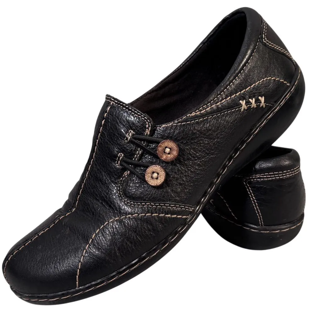 Clarks Women's Slip-On Comfort Shoes in black offer a casual style with a leather upper and syntheti... Show more